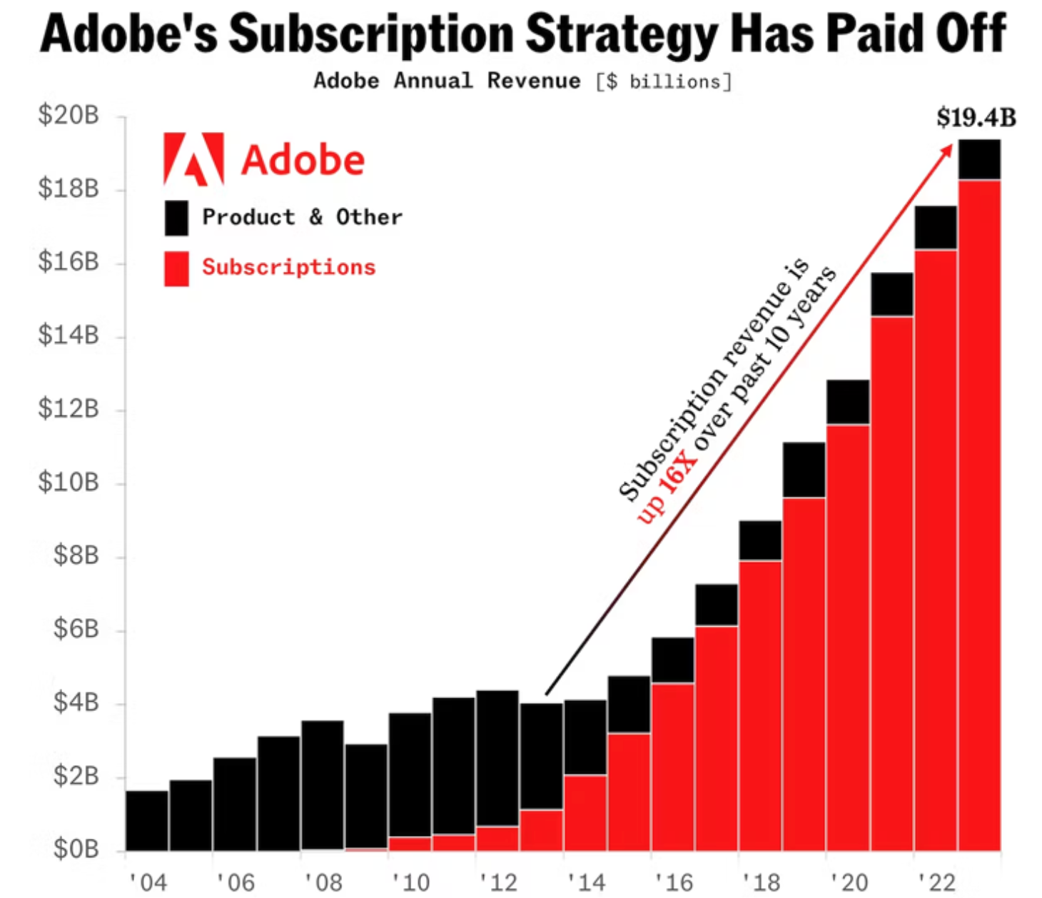 재무적 관점에서 보면, 어도비는 고객이 한 번 구매하면 평생 소유하는 영구 라이선스 모델에서 제품 구매와 관련된 사용 약관이 월별 구독 모델로 전환하는 중요한 전환을 성공적으로 이뤘습니다. 이로 인해 지난 10년간 구독 매출은 16배 증가하여 회사의 성장을 견인하고 2,000억 달러 이상의 거대 기업으로 성장했습니다. 이 변화는 어도비가 시장의 변화에 빠르게 적응하며 사용자의 니즈에 맞춰 유연하게 대응할 수 있는 능력을 강조하는 결과를 가져왔습니다. (하지만 여러 커뮤니티에서는 긍정적인 신뢰는 없다는 반응입니다.)