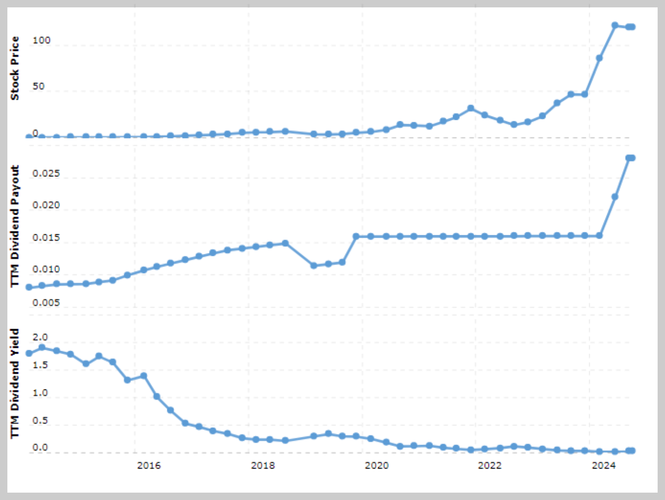 엔비디아(NVIDIA)는 2012년부터 주주들에게 배당금을 지급하기 시작했습니다. 그 해, 첫 배당금은 주당 약 0.001875달러로 시작했으며, 당시 약 2%의 배당 수익률을 기록했습니다. 이후 엔비디아는 꾸준히 배당금을 인상해왔는데, 가장 최근에는 분기당 0.01달러로 원래보다 5배가량 증가했습니다. 그러나 엔비디아의 주가가 지난 10년간 27,000% 이상 급등하면서 현재 배당 수익률은 약 0.03%로 하락해, 높은 배당보다는 성장에 집중하는 기업의 기조를 엿볼 수 있습니다.